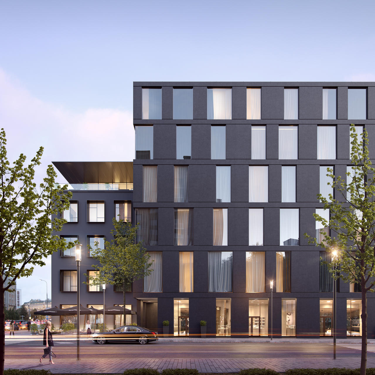 За лаконичными фасадами скрываются апартаменты для постоянного проживания и бутик-отель с круглосуточным сервисом, а также просторная торговая галерея.